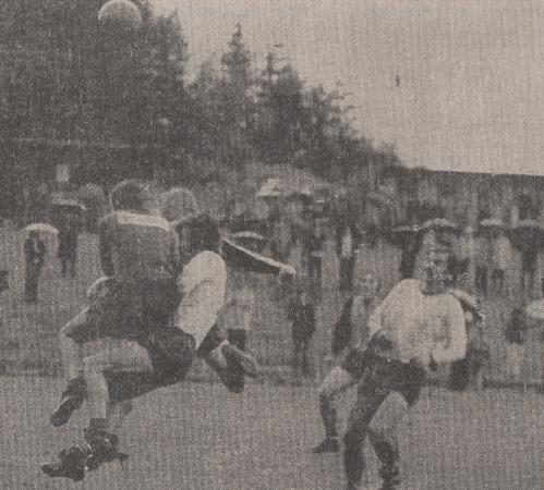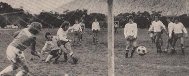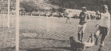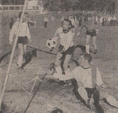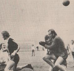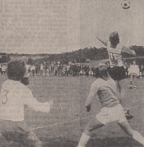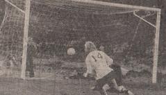 (Bildet; Hodeskrensen som snudde kmapbildet i Langevåg. Arild Andersens hårmanke mellom keeper og Igesund som kolliderer. Ballen går videre inn i mål mens Ronald Moen ser på.)