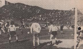 Man var kommet nesten halvtimen da de 6-700 tillskuerne fikk se det første målet. Naturligvis ble det endelig mål ved innkast (!!). Rune Vik kastet, ballen dalte ned i retning streken ,og en forsvarer måket den videre i mål. 2-o kom etter forarbeid av Kjartan Paulsen. Han la til B.Myklebust som la til rette for Fred Frantzens skuddfot. ÅIF reduserte ved Svein Sørheim etter corner. Men Bergsøy kom tilbake og ledet 3-1 til pause, Frøystad smellte til frå 16 meter.