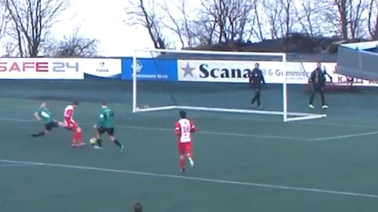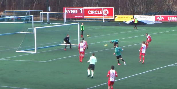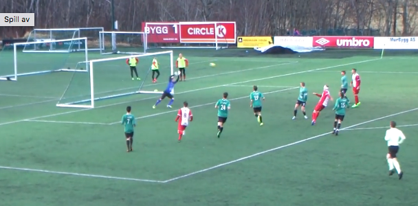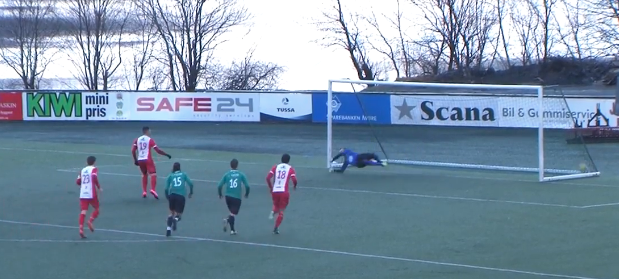 (Eirik Heltne har ingen problemer med å sette inn 3-0 etter at Franjo serverte ballen inn fra siden )