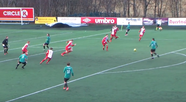 (En flott pasning ut 45 grader, og Bergsøyforsvaret var utspillt. Avsluttningen gikk fint nede i keepers venstre hjørne til 3-3. )