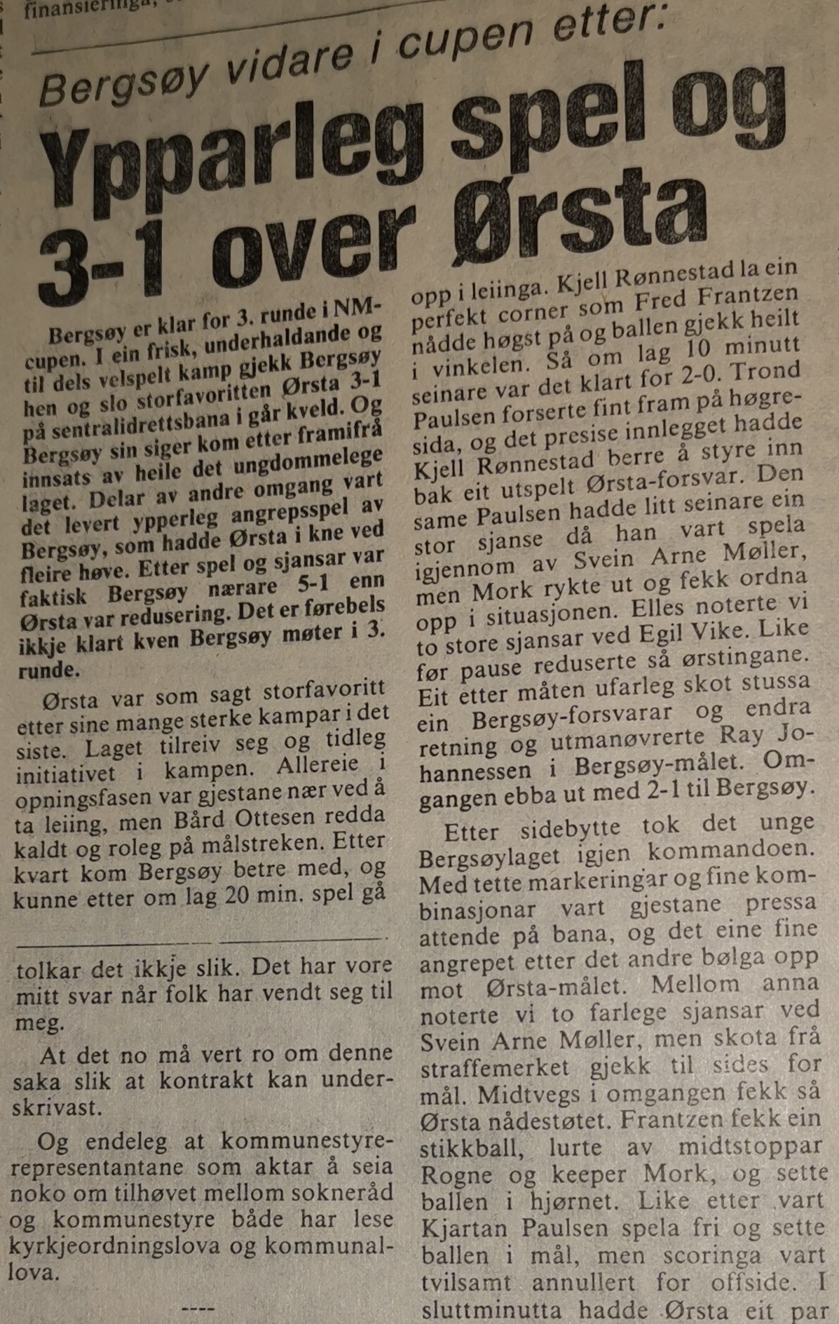 Det blei ein frisk og underhaldande kamp på sentralidrettsbana idet Bergsøy og Ørsta spelte om ein plass i cuppens tredje runde. Bergsøy sin siger kom etter ypperlig angrepsspel, og heimelaget hadde Ørsta i kne ved flere anledningar.