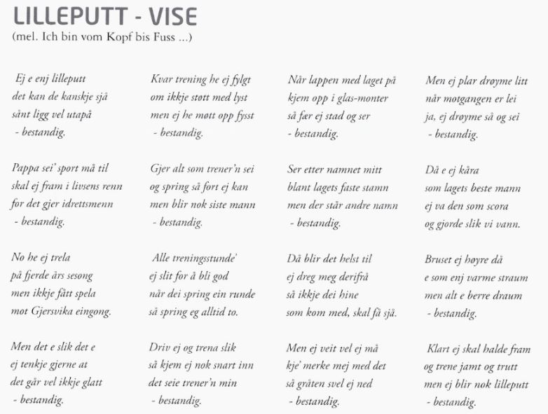 Når vi er samlet her til fotballfest og innbeden er som deres gjest har vi lyst med kommentaren kommen da sesongen nu er omme. Først til han som passer buret han er ikkje lett å lure. Jan Karsten er en kjernekar, han er spretten, god og snar. Høgre back var Agnar Vike, så kom Kjell og ble hans like, den ene vår, den andre høst, gikk de på med mot i brøst. Knut Igesund det er mannen, med mot i brystet og vett i pannen. En superback av kraft og stål, han kan også skyte mål. Neste mann er Ronald Moen, når han får på seg fotballskoen, går han frem med fart og stil: En glitakler uten tvil. Venstre back er Gisle Vike, den gutten må jo alle like han kan mye fra seg lære også i det militære. Jack er en av lagets topper, stadig rundt på banen hopper når han spiller fram i senter, blir det slik som alle venter. En terrier foruten like, det må være Rune Vike - Når han går opp og vrir på knollen sitter ballen rett i gollen. Sveinung suser fram på vingen drible hurtig, det er tingen. Da han frem til målet kommer er det sjelden at han bommer. Uten tvil vi også torer kåre Fred som årets scorer. Seksten mål er mer enn bra han fortjener hipp hurra. Kjartan er kaptein og leder noe som han gjør med heder. Trener har han også vært difor har det gått så svært. Når han Knut på lodda drar, er det Bjørn som overtar og nå vi skal være ærlig er de begge unnværlig. Oskar han fikk banesår dette skjedde tidlig vår.. Vi har mange bra reserver vi behøver ei frå Hødd å verve. Nu når disse versa slutter glemmes ei de andre gutter. Alle som har gjort sitt beste, for at vi idag skal feste.