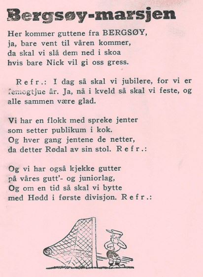 Ikveld er namnet berre Bergsøy og Bergsøynamnet gir oss von. For nesste år skal raudt og kvitt tøy Få spele i 2.divisjon. Det kunne jammen ha gått verre Om ikkje alle kjempa slik For gudsjelov slo vi Sverre Og lurte godt Skarbøvik. Det var i fleire år på hekta at ikkje Bergsøy låg på topp En skulle tru at skjebna nekta at Bergsøy skulle rykke opp Men no i kveld er plassen sikra og heile Herøy står i brann Kontrakta er i alle fall spikra og spikra har vi alle mann Og vi har ikkje Engelsk trenar og vi har ikkje innkjøpt skyts. Vi er en flokk med gode vener og vi har Asbjørn og na Prytz. Vi stolar fullt og heilt på våre og vi er en samansveisa flokk. Vi veit at Bergsøyfolk kan score og alt i alt så er det nok